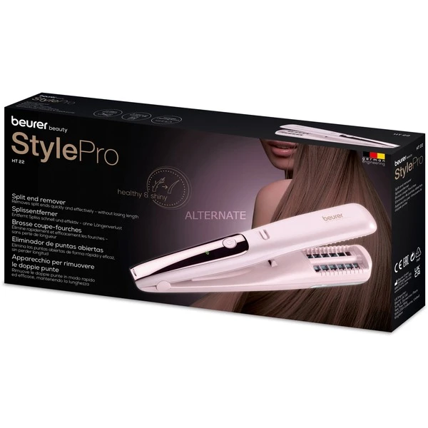 Pour des longueurs de cheveux soignées : Avec le dissolvant d’épissure HT 22 de Beurer, vous pouvez libérer les pointes de cheveux mèche par mèche des pointes fourchues – sans couper les pointes chez le coiffeur. Il dispose d’une chambre de collecte pour les cheveux coupés et peut être utilisé jusqu’à 2 heures avec une charge complète. Grâce à la fonction d’entraînement direct, le HT 22 peut être utilisé immédiatement même lorsque la batterie est déchargée en fonctionnement sur secteur.