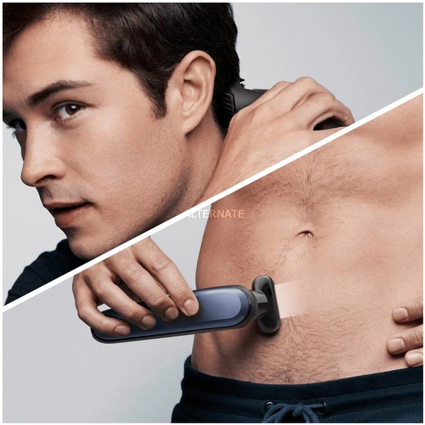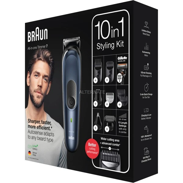 10 en 1 : le kit tondeuse Braun MGK7 pour homme est entièrement équipé pour la tonte de la barbe, du visage, des cheveux, des oreilles, du nez et du corps. Plus affûtée. Plus rapide. Plus efficace. La tête de tondeuse a une surface de coupe plus large, coupant plus de poils à chaque passage¹. Contrôle total de la tête aux pieds : le moteur AutoSense et le sabot de précision, avec 20 % de plastique en moins, offrent une tonte sans effort de la moustache, du bouc, de la barbe de 3 jours ou des poils du corps. Conçue pour durer: cette tondeuse pour homme est dotée de lames puissantes et inusables pour une tonte facile et uniforme des poils, quelle que soit leur longueur. Conception allemande avancée : 100 % étanche, avec une batterie Li-Ion puissante qui offre 100 minutes d’autonomie. La tondeuse est fournie avec un sabot pour zones sensibles, pour une tonte ultra-douce. Plus affûtée. Plus rapide. Plus efficace.¹ La surface de coupe plus large de la tête de tondeuse permet de capturer et de couper plus de poils à chaque passage par rapport aux tondeuses Braun précédentes. Créez votre look plus rapidement. Barbes courtes à longues Les sabots courts et longs vous aident à tailler et entretenir les barbes courtes à longues (de 0,5 à 21 mm). Rasage du corps Rasez toutes les parties de votre corps en toute sécurité, des aisselles au torse jusqu’à l’aine. Tondeuse à cheveux Coupez vos cheveux selon vos envies et avec précision grâce à deux sabots réglables pour différentes longueurs (de 0,5 à 21 mm). Définition des contours et tondeuse de précision Créez des lignes et des contours précis sur le cou et les joues avec la tête de tondeuse à barbe et la tête de tondeuse de précision. Convient pour tous les types de barbes La technologie AutoSense innovante de Braun adapte la puissance du moteur à l’épaisseur et à la densité des poils, pour une tonte facile et sans effort. Lavable et étanche Utilisez l’appareil en toute sécurité sous la douche ou rincez-le sous l’eau pour un nettoyage facile. Batterie Li-Ion longue durée 100 minutes d’autonomie. Recharge complète en 1 heure. Charge rapide en 5 minutes pour un rasage. Le kit styling optimal Le kit styling optimal tout-en-un offre 10 fonctions avec un seul appareil. ¹par rapport aux tondeuses Braun précédentes